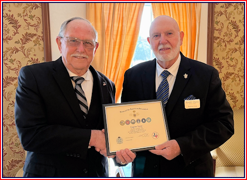 Adjutant Rodney Love presents Louis Koob with a Certificate of Appreciation for his service in the United States Army Air Force.